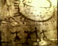 Petroglyphs dating back thousands of years ago by ancient Indians in the American Southwest. According to Indian folklore, two objects collided high in the sky and one crash-landed in the region of Death Valley. Some men arrived (presumably in another ship) and spent some time repairing the damaged craft and were observed by the local Indians. The two images below may possibly depict the ship (left) used by the men who came to repair the damaged craft. In comparing the two images, the one on the right seems to depict structural damage around the edges and the bottom. Could it be the one that allegedly crashed? The images are stills taken from an old TV series entitled "In search of..." hosted by Leonard Nimoy.