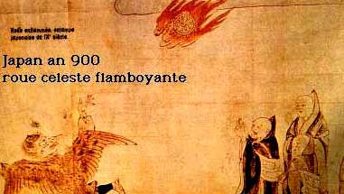 Illustration depicting a sighting of a burning wheel in the year 900 over Japan.