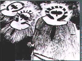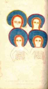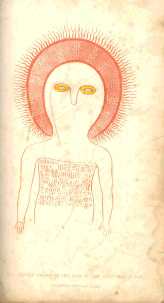 These are illustrations from a book by Lt. Grey. "Journals of Two Expeditions of Discovery in North-West and Western Australia 1837, 1838, & 1839". He led an expedition in the 19th century to some caves near the Glenelg River region of Kimberley, Northern Australia where he came across a series of cave paintings. The beings are called the Wandjina by the Aboriginies who painted them.