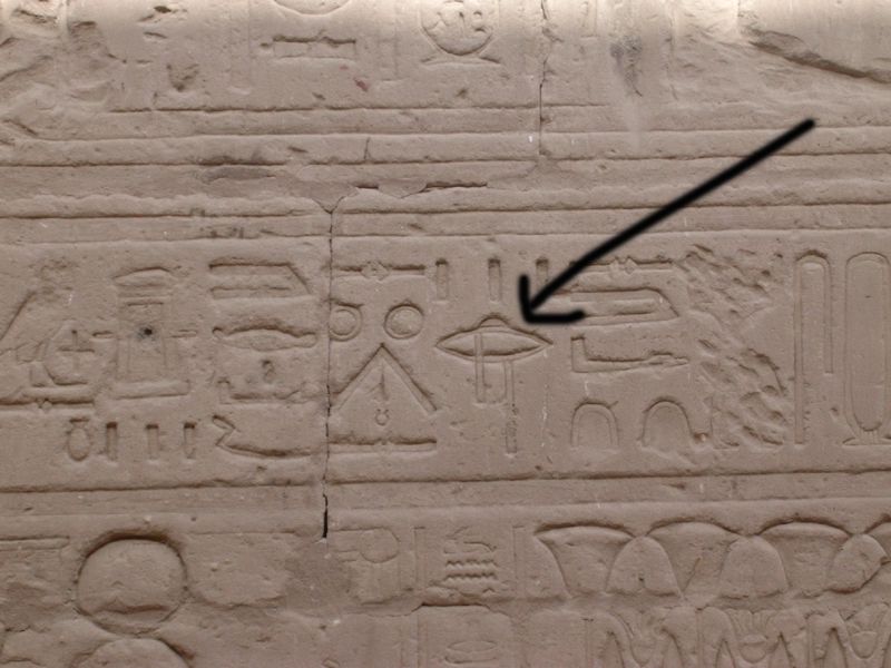 ufo picturesThis picture shows what I am certain is a picture of a ufo with 2 beams coming down on each side, the reason I say those 2 lines one on each side are beams is because I am guessing with substantial proof that these beams we see are what crop circles are built with, many witnesses have claimed they saw beams of light come down from the space crafts and then the crop circles appeared. Their ufo crafts may have different purposes for their beams that they apparently use with their ships for crop circles. In the picture we can also see what I think is something comparable to aircraft on Earth, it looks like an aeroplane. Aliens probably or more reasonable could use aircraft when in the atmosphere of a planet rather than using conventional discs. Aliens probably have several type of aircraft and spacecraft. This could just be a ship of another race or another ship of their own race's design. In either case we often see this craft in Egypt in hieroglyphics. We also see a star in this glyph which often refers to the heavens (outer space).