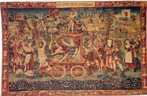 This is a tapestry called Summer's Triumph It was created in Bruges in 1538 and presently resides at the Bayerisches National Museum. You can clearly see several disc shaped objects in the top of the tapestry.