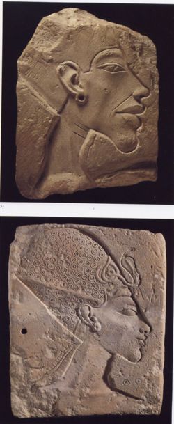 In this picture we see 2 heads of what are supposedly Egyptian Gods of the Amarna Period. Notice the first face, his eyes are a little larger than our's and his lips are african almost. As many other of the so called Egyptians are not like his. Some of the figures look white or like Americans almost. It just doesn't add up, when you compare the profiles of many of the Egyptians painted and carved on walls and immortalized in statues you notice too many anomolies. Notice also the necks of both individuals. Their necks are long and slender, indicative of an alien race, as our own necks are not like these.