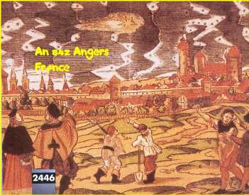 This is an illustration of a sighting that occured in the french town of Angers in the year 842. I'm not sure when this illustration was done or who it was by however.