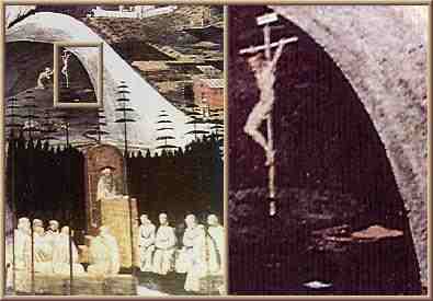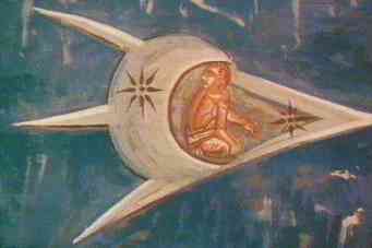 The first picture shows a fresco entitled "The Crucifixion" and was painted in 1350. Two objects with figures inside can be seen in the top left and top right of the fresco. Two enlargements of these objects are shown above. The fresco is located above the altar at the Visoki Decani Monestary in Kosovo, Yugoslavia