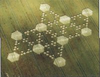 This bizarre yet pretty shape is said to be foldable into a tetrahedron. The tetrahedron is a six pointed star, in other words the shape of the star of david in 3D. If you fold the thing to the left on the centers of the hexagons in the right way it should produce the right form. Also notice the sets of four circles within the photo. Maybe they are to help us fold this immense craft of mammoth artistic playfullness? Who knows, all I know is that it is an interesting design. More of a crop formation than a crop circle in this case.