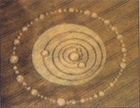 This crop circle photo shows us several circles within circles surrounded by one large circle composed of different sized circles. On the largest inside circle you notice smaller circles inside, the placement of the inside circles forms moon shapes in double. Could the inside smaller circles represent planets? Strange??? Great crop circle photo.